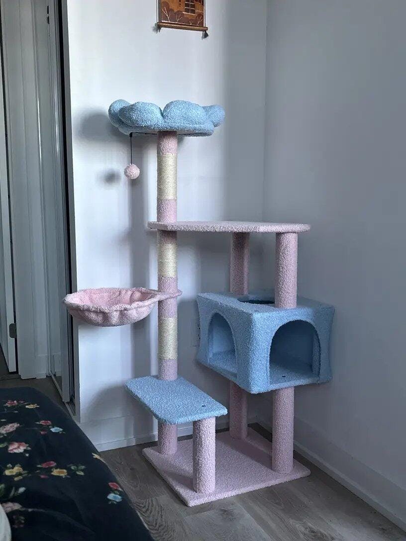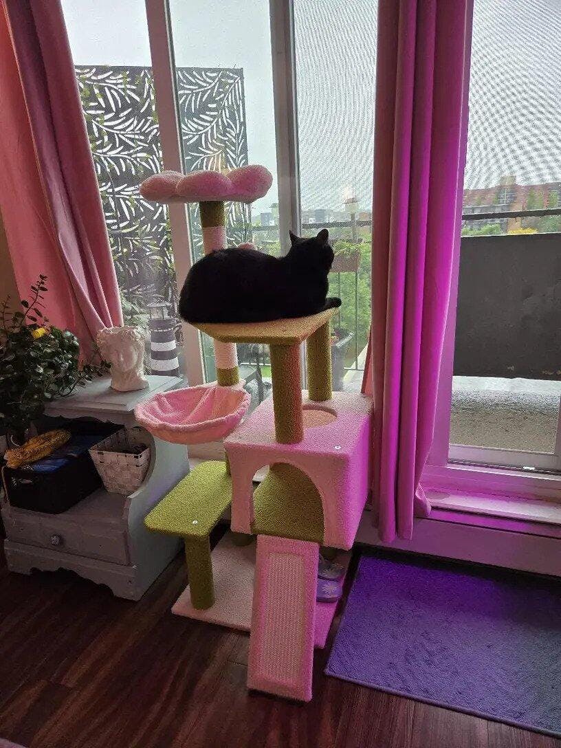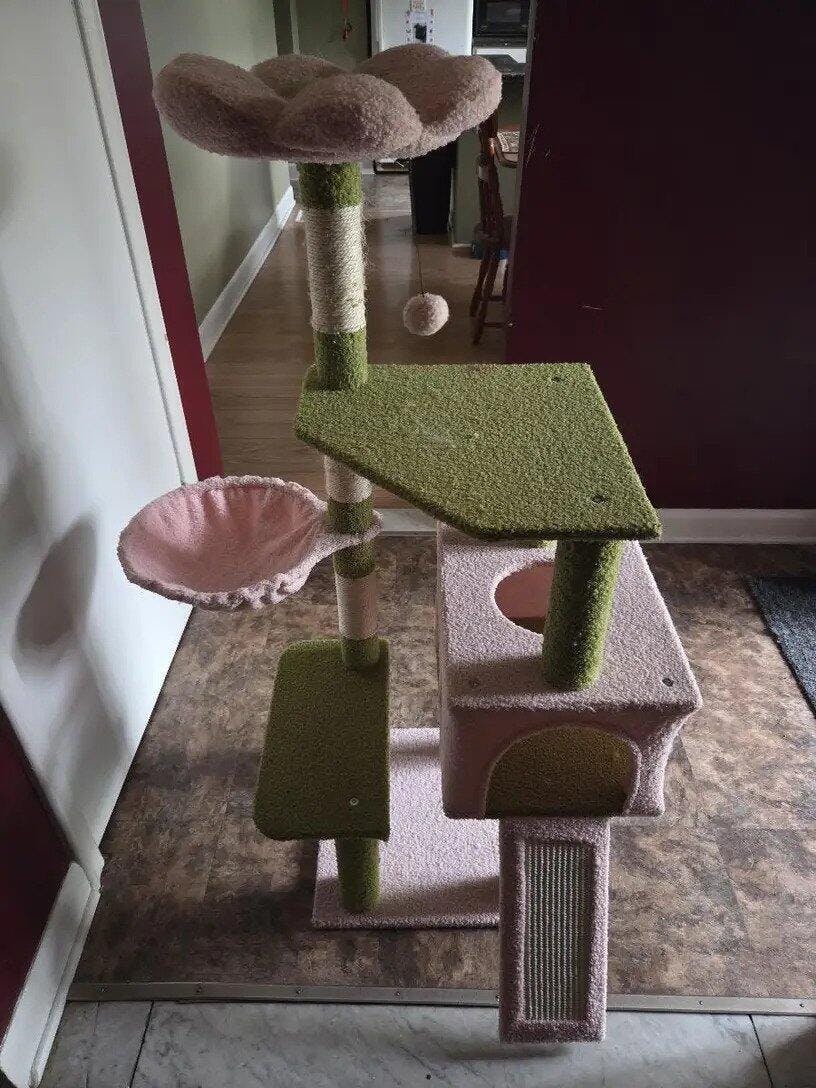 Super cute, sturdy, easy to assemble (took me about 30 minutes and it came with the tool needed for assembly) plus my cat likes it which is great! The only thing of note is that the pink and green material is very thin, so if your cat is a heavy/aggressive scratcher then it will most likely rip very easily. Also, the basket is a bit small and support is minimal, so if you have a chunky boi or a big cat, it probably won't fit or support them very well 😂